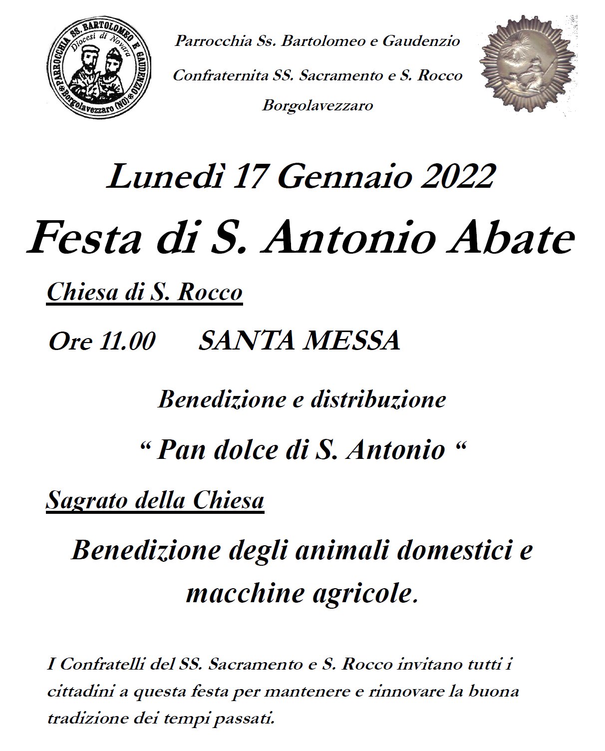 A Borgolavezzaro, lunedì 17 gennaio nella Chiesa di San Rocco dopo la Messa delle ore 11: benedizione del pane dolce. Si prosegue sul sagrato con la benedizione degli animali domestici e dei mezzi agricoli.
