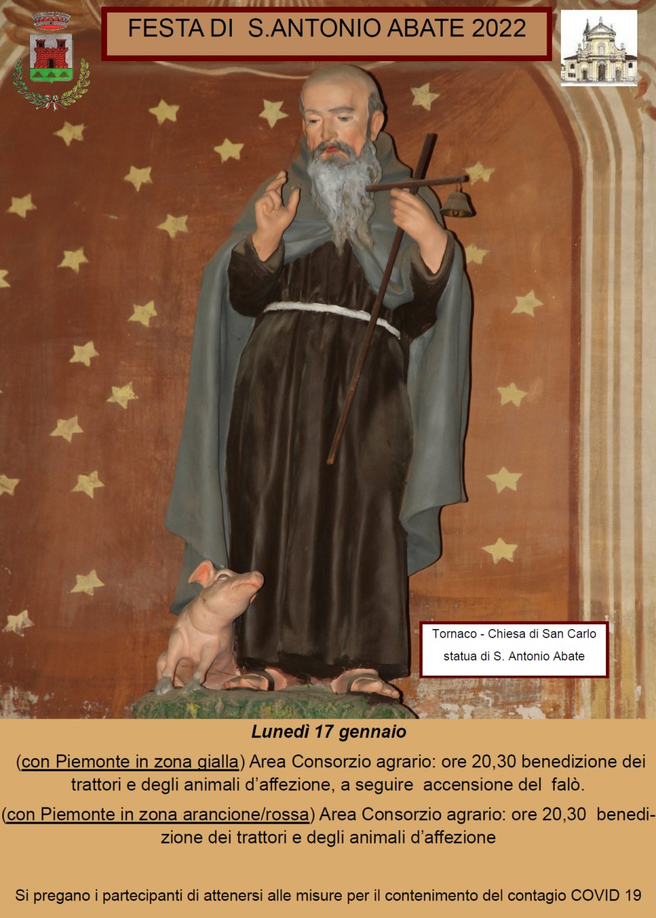 A Tornaco, la Messa si terrà in chiesa parrocchiale alle ore 18, lunedì 17 gennaio. Seguirà alle 20.30 nell’Area Consorzio agrario la benedizione degli animali d’affezione e dei trattori, con l’accensione del falò (solo se si rimane in zona gialla).